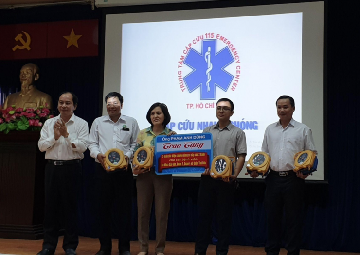 Các trạm vệ tinh của các bệnh viện tiếp nhận quà tặng thiết thực (máy sốc điện chuyên dùng) cho các bệnh viện có loại hình xe cấp cứu 2 bánh