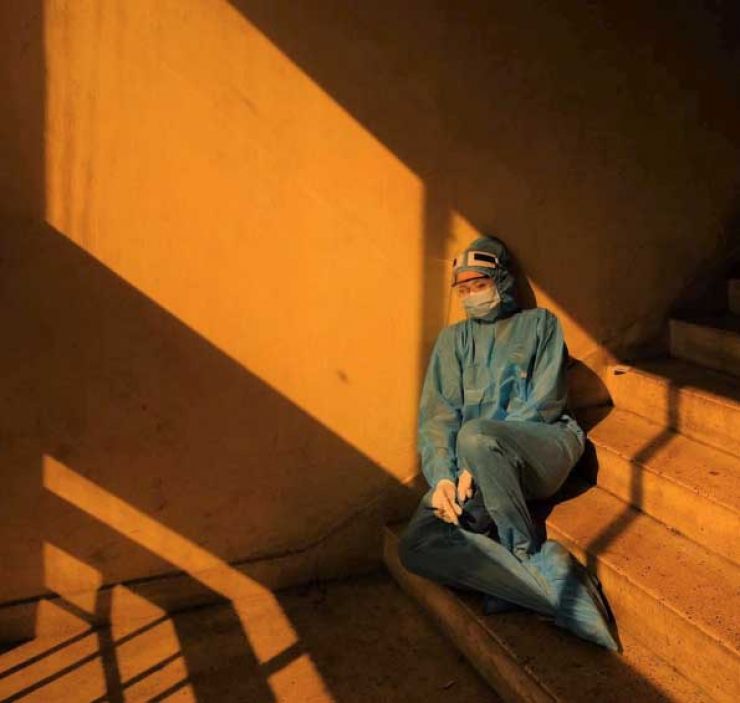 Những ngày làm việc liên tục, các bác sĩ trẻ phải tranh thủ gục xuống nơi bậc thềm để lấy sức Ảnh: NVCC