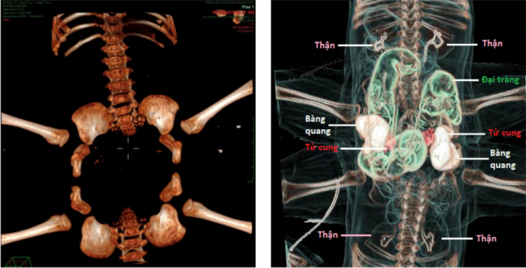 Với các phương tiện chẩn đoán hiện đại dành cho Nhi khoa như chụp cộng hưởng từ (MRI), Chụp vi tính cắt lớp mạch máu (CTA) các bác sĩ chẩn đoán hình ảnh của bệnh viện đã phát hiện hàng loạt các bất thường tại vùng bụng chung. Về hệ tiêu hóa: 2 bé có chung 1 phần hồi tràng, 1 khung đại tràng và chỉ có 1 lỗ hậu môn. Về hệ thận niệu: 2 bé có 2 bàng quang nằm 2 bên của ổ bụng chung, mỗi bàng quang được 2 niệu quản xuất phát từ 2 bé khác nhau đổ vào thay vì của cùng 1 bé. Về cơ quan sinh dục 2 bé có tử cung âm đạo đôi. Ngoài ra, 2 bé còn có hở khớp mu, khung chậu 2 bé lại xếp thành 1 vòng tròn.