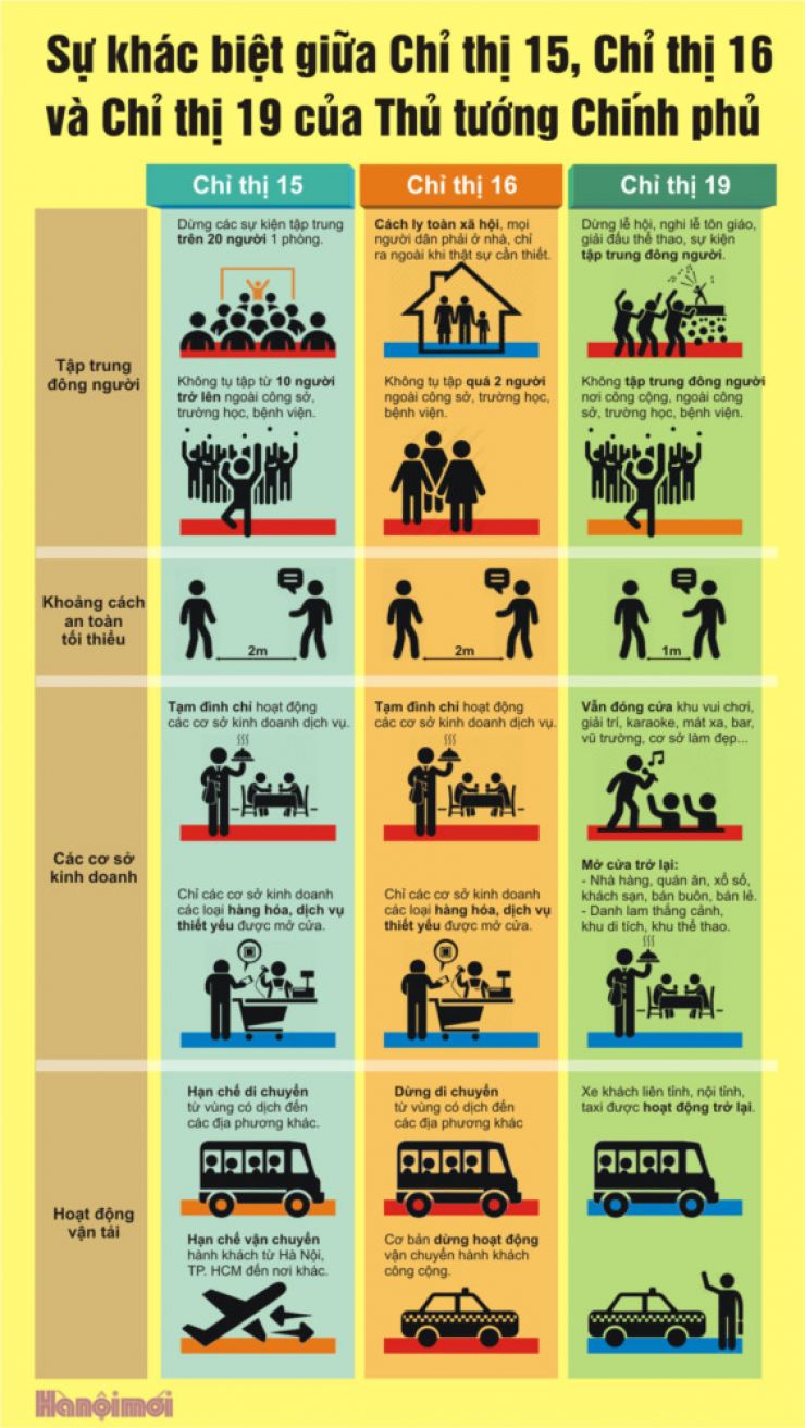 (HNMO) - Chỉ thị 15, 16 và 19 đều là chỉ đạo của Thủ tướng Chính phủ về các biện pháp phòng, chống dịch Covid-19 trong những thời điểm khác nhau. Sự khác biệt giữa 3 chỉ thị này được thể hiện ở những nội dung chính dưới đây.