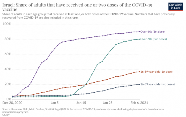 Tính đến ngày 6/02/2021, đã có 45,3% dân số Israel được tiêm liều đầu tiên và 29,7% được tiêm cả hai liều vắc-xin hoặc được phục hồi từ COVID-19 (người trên 60 tuổi là 89,9% và 80% tương ứng).