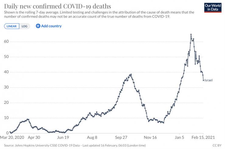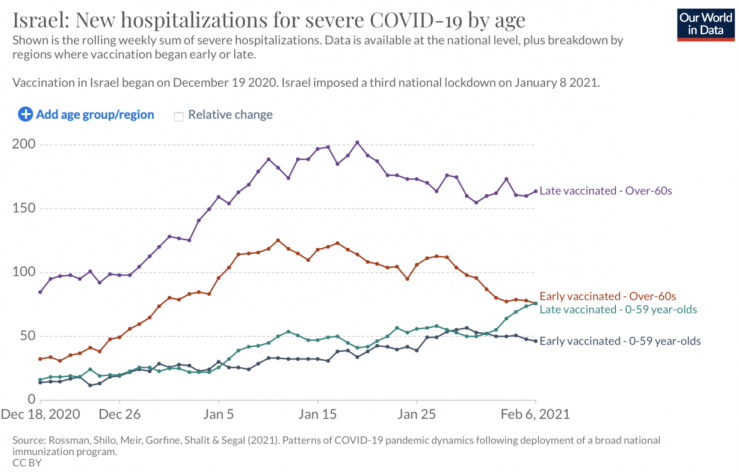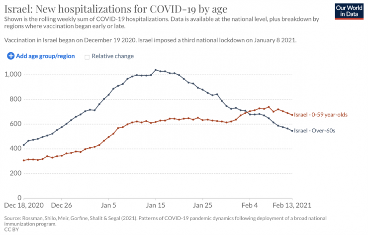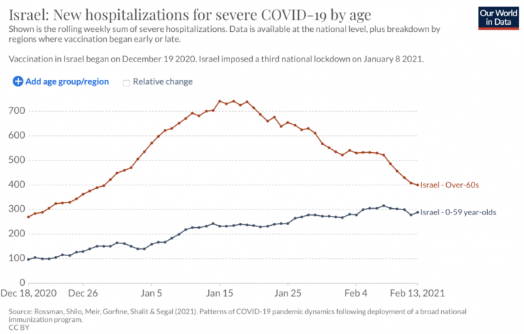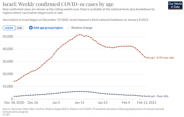 Vào giữa tháng 1/2021, số ca mắc COVID-19 và số ca nhập viện tại Israel bắt đầu giảm, trong số này thì số lượng người lớn tuổi càng ngày càng giảm. Xu hướng này càng rõ ràng hơn ở các thành phố được tiêm chủng sớm so với các thành phố tiêm chủng muộn. Một mô hình thay đổi như vậy đã không được quan sát thấy trong lần phong toả trước.