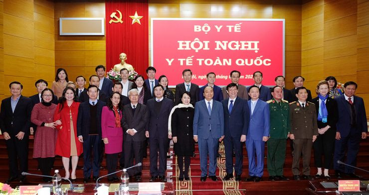 Thủ tướng Chính phủ Nguyễn Xuân Phúc, Bộ trưởng Bộ Y tế Nguyễn Thanh Long cùng lãnh đạo các Bộ, Ban, Ngành, Tổ chức Quốc tế và lãnh đạo các địa phương cùng chụp ảnh tại hội nghị
