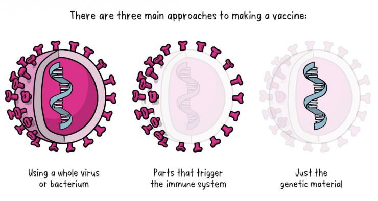Có 3 cách tiếp cận chính để thiết kế ra các loại vắc xin. Sự khác biệt chính của 3 cách thiết kế đó là: (1) Sử dụng toàn bộ vi rút hay vi khuẩn để tạo ra vắc xin; (2) Chỉ sử dụng những thành phần của vi rút có tác dụng khởi phát hệ thống miễn dịch; (3) Chỉ sử dụng những vật liệu di truyền của vi rút nhằm cung cấp cho cơ thể các hướng dẫn để tạo ra các protein cụ thể (giống protein có trong vi rút) có tác dụng khởi phát hệ thống miễn dịch.