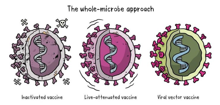 Cách đầu tiên để tạo ra vắc-xin là lấy chính các vi rút hoặc vi khuẩn gây bệnh đã bị bất hoạt bằng cách sử dụng hóa chất, nhiệt hoặc bức xạ. Cách tiếp công nghệ này đã được chứng minh là có hiệu quả và đây là cách sản xuất ra các vắc xin cúm và bại liệt, với loại vắc xin này có thể được sản xuất ở quy mô hợp lý. Tuy nhiên, đòi hỏi các cơ sở phải có những phòng thí nghiệm đặc biệt để nuôi cấy vi rút hoặc vi khuẩn một cách an toàn, đòi hỏi thời gian sản xuất tương đối dài và có thể sẽ cần tiêm nhắc lại 2 hoặc 3 liều.