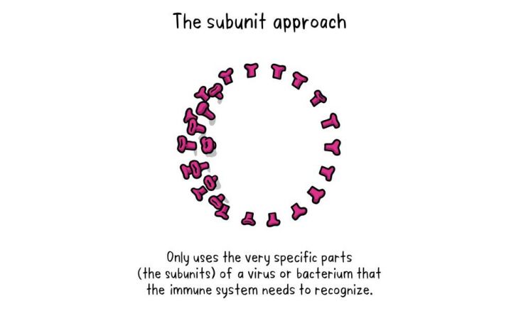 Là những vắc xin chỉ sử dụng những phần rất cụ thể (các tiểu đơn vị) của vi rút hoặc vi khuẩn mà hệ thống miễn dịch có thể nhận biết. Loại vắc xin này không chứa toàn bộ vi rút hoặc sử dụng vi rút an toàn làm trung gian chuyên chở (vectơ). Các tiểu đơn vị có thể là protein hoặc đường. Hầu hết các loại vắc xin trong lịch tiêm chủng cho trẻ là vắc xin tiểu đơn vị, bảo vệ người dân khỏi các bệnh như ho gà, uốn ván, bạch hầu và viêm màng não mô cầu.