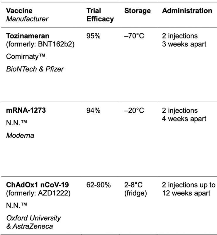 Kể từ ngày 08/01/2021, cả ba loại vắc xin nêu trên đã được chấp thuận sử dụng rộng rãi ở Châu Âu và Mỹ. Về hiệu quả bảo vệ của vắc-xin: trong các thử nghiệm ở giai đoạn III, tozinameran và mRNA-1273 chứng minh có hiệu quả trên 94%, trong khi ChAdOx1 nCoV-19 có hiệu quả từ 62-90%. Cả 3 loại vắc-xin đều được tiêm thành hai liều cách nhau ba tuần (nRNA-1273), bốn tuần (Tozinameran) hoặc 12 tuần (ChAdOx1). Người tiêm vắc-xin sẽ được bảo vệ khỏi bị nhiễm SARS-CoV-2 từ khoảng 7 ngày sau khi tiêm lần thứ hai; tuy nhiên, với mũi tiêm vắc-xin đầu tiên đã có thể cung cấp biện pháp bảo vệ cơ thể, nhất là đối với nhiễm COVID-19 nghiêm trọng.