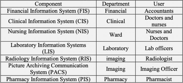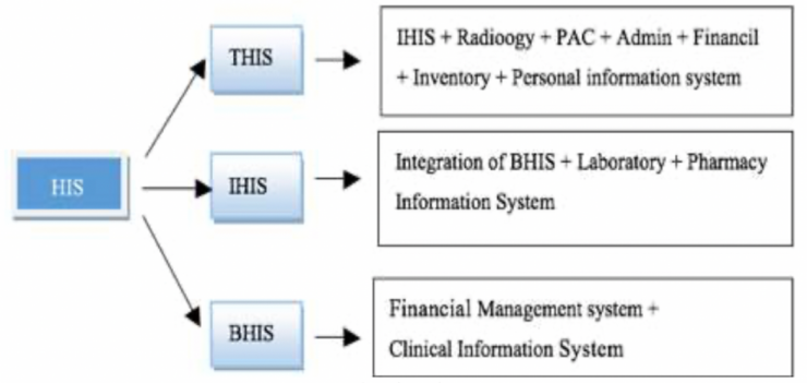 Việc Bộ Y tế Malaysia phân nhóm các bệnh viện thành 3 nhóm: BHIS, IHIS VÀ THIS là căn cứ vào các thành phần hiện có của hệ thống thông tin bệnh viện (HIS) như sau: