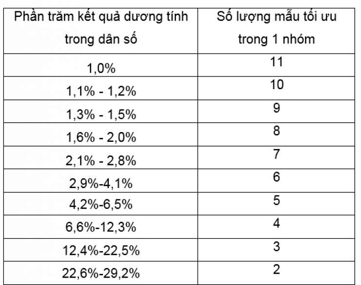 Một câu hỏi quan trọng đặt ra ở đây là số lượng mẫu trong một nhóm bao nhiêu là phù hợp để dử dụng ít kit xét nghiệm nhất. Số lương mẫu tối ưu trong 1 nhóm cũng phụ thuộc vào tỷ lệ kết quả dương tính trong dân số. Dưới đây là bảng thống kê số lượng mẫu tối ưu trong 1 nhóm để sử dụng ít số lượng kit xét nghiệm nhất trên 100 mẫu.