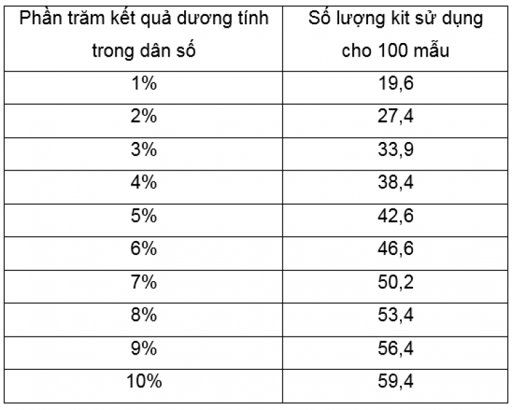 Một câu hỏi quan trọng đặt ra ở đây là số lượng mẫu trong một nhóm bao nhiêu là phù hợp để dử dụng ít kit xét nghiệm nhất. Số lương mẫu tối ưu trong 1 nhóm cũng phụ thuộc vào tỷ lệ kết quả dương tính trong dân số. Dưới đây là bảng thống kê số lượng mẫu tối ưu trong 1 nhóm để sử dụng ít số lượng kit xét nghiệm nhất trên 100 mẫu.