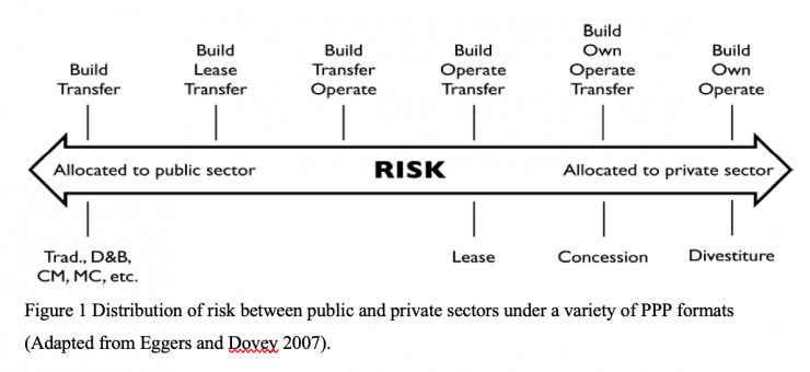 Các loại hình PPP trên có bản chất tương tự nhau ở chỗ khu vực tư nhân sẽ chịu trách nhiệm thiết kế, tài chính, xây dựng, vận hành và bảo trì cơ sở trong thời gian thỏa thuận (thường là 25-30 năm). Tuy nhiên, sự khác biệt duy nhất của họ nằm ở quyền sở hữu của cơ sở trong thời kỳ nhượng quyền và liệu quyền sở hữu có được chuyển lại cho chính phủ sau thời gian nhượng quyền và mức độ giả định rủi ro giữa khu vực công và tư như hình dưới đây: