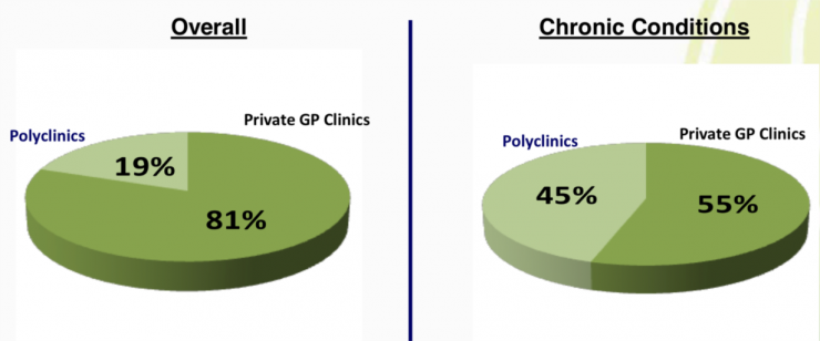 Do dân số già và tần suất các bệnh mạn tính không lây nhiễm gia tăng, Bộ Y tế Singapore đã xây dựng kế hoạch tổng thể về chăm sóc sức khoẻ ban đầu (Primary Care Masterplan) nhằm làm tăng sự tiếp cận, khả năng chi trả, và chất lượng các dịch vụ chăm sóc sức khoẻ ban đầu cho người dân Singapore. Theo đó, vào năm 2010, một loại hình mới ra đời là Trung tâm sức khoẻ cộng đồng – CHC (Community Health Centre) có chức năng cung ứng các dịch vụ chăm sóc hỗ trợ như chụp võng mạc bệnh nhân bị tiểu đường, tập vật lý trị liệu đối với những bệnh nhân đang được theo dõi và chăm sóc tại các phòng khám tư. Từ năm 2013, một loại hình mới thứ hai là Phòng khám Y học gia đình - FMC (Family Medicine Clinic) bao gồm các bác sĩ GP cùng làm việc với nhau và với các chuyên gia các chuyên ngành khác hướng đến cung ứng dịch vụ chăm sóc theo nhóm bác sĩ và toàn diện.