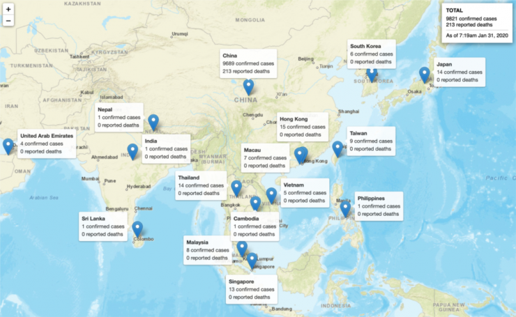 Hình ảnh Infographic cập nhật liên tục theo thời gian thực về tình hình dịch bệnh viêm đường hô hấp do chủng mới của vi rút corona (nCoV) trên thế giới (CNA), lúc 7g19ph ngày 31/01/2020: số ca mắc là 9.821, số ca chết là 213 (tất cả ở TQ)