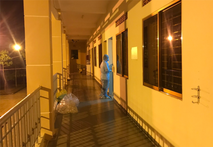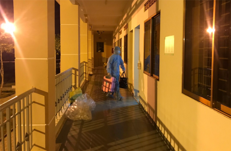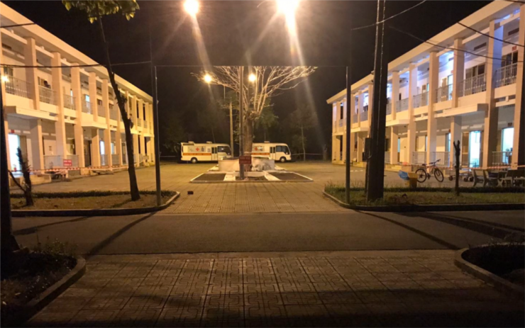 Không gian yên tĩnh của Bệnh viện dã chiến về đêm, mọi người cách ly tại các khu nhà của bệnh viện đã ngủ say ngoại trừ kíp trực đang bận rộn tiếp nhận người cách ly mới được chuyển đến