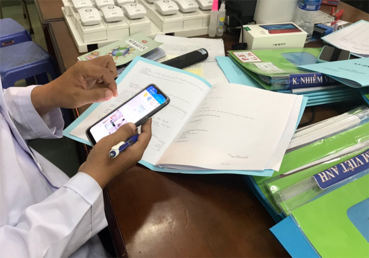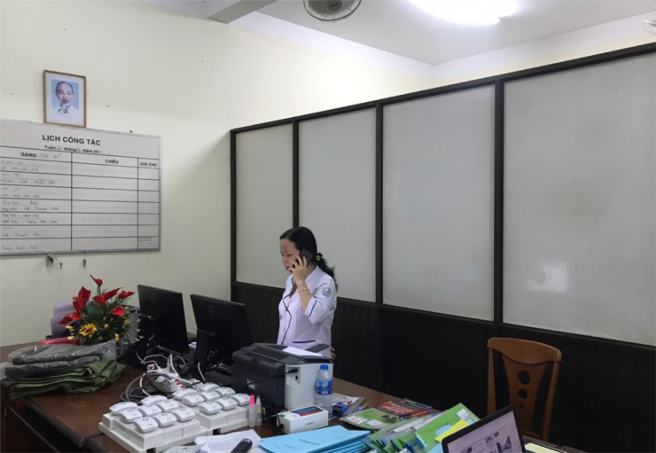 Tại khu hành chánh, bác sĩ trực tiếp tục hoàn tất hồ sơ bệnh án cho người cách ly, bổ sung các chi tiết còn thiếu vào hồ sơ bằng ứng dụng trên điện thoại thông minh đã ghi nhận lại khi đang giao tiếp