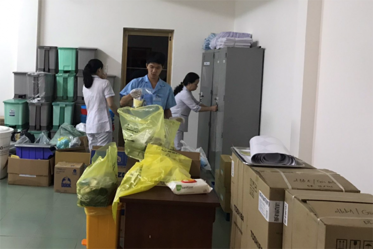 3 nhân viên khác khẩn trương chuẩn bị đồ dùng cá nhân và các tiện ích khác cho người sắp được cách ly tại khu hành chánh của BV dã chiến