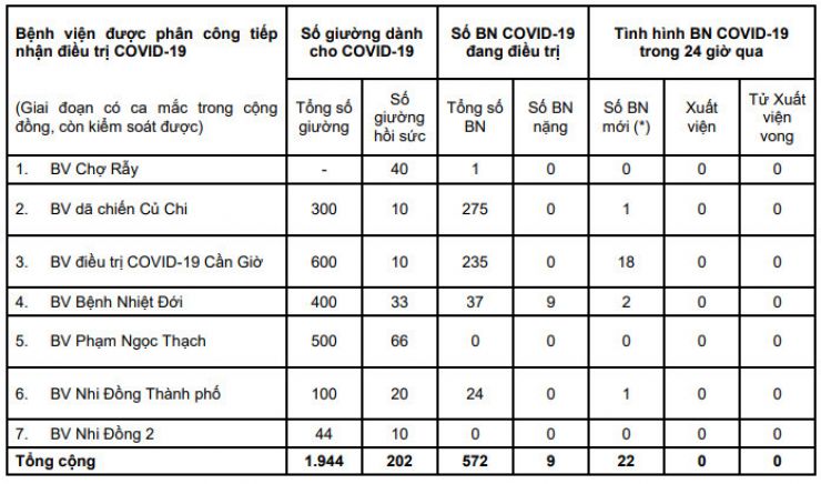 Trong 24 giờ qua, các bệnh viện được phân công đã tiếp nhận thêm 22 trường hợp (+) mới. Tổng số người bệnh COVID-19 (+) hiện đang được cách ly điều trị tại các bệnh viện được phân công là 572 trường hợp.