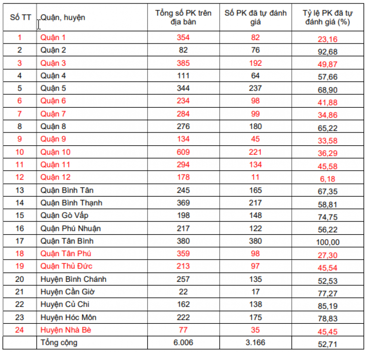 Bên cạnh đó, Sở Y tế yêu cầu các Phòng Y tế quận, huyện sau có tỷ lệ các PK tự đánh giá còn thấp cần khẩn trương đẩy mạnh hoạt động tự đánh giá của các PK tư nhân trên địa bàn theo đúng kế hoạch Sở Y tế đã phổ biến, trong đó đặc biệt lưu ý: quận 12 (6,18%), quận 1 (23,16%), quận Tân Phú (27,30%), quận 9 (33,58%), quận 7 (34,86%), quận 10 (36,29%).