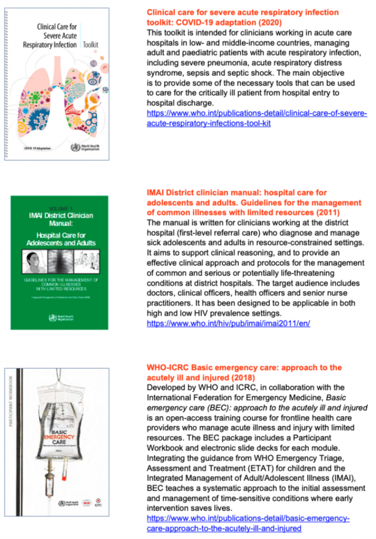 Ngoài những hướng dẫn mới, tài liệu “Clinical management of COVID-19” được biên soạn dựa trên cơ sở các khuyến cáo khoa học vẫn còn giá trị từ ít nhất 7 tài liệu hướng dẫn trước đây của TCYTTG, bao gồm: