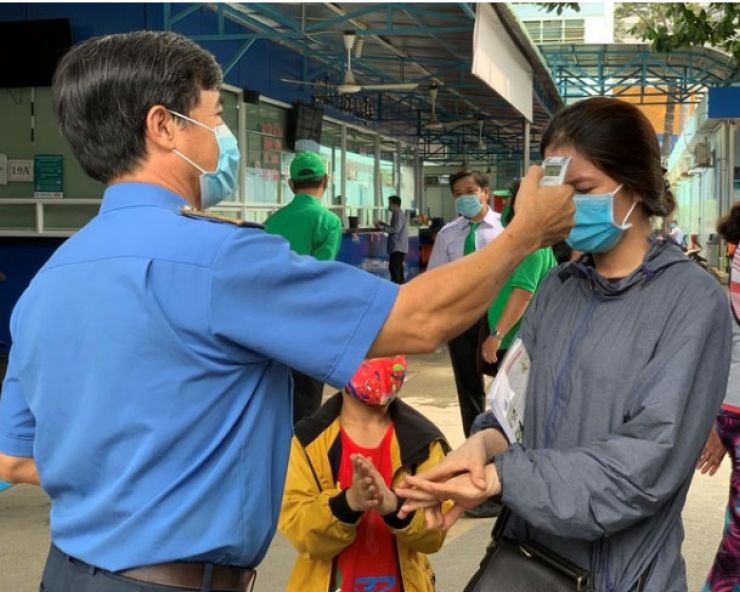 Ghi nhận tại Bệnh viện Quận 2 (TP.HCM), ngay cổng bệnh viện cũng đã được trang bị máy đo thân nhiệt từ xa. Mọi người đến bệnh viện đều phải khai báo y tế và đeo khẩu trang, rửa tay diệt khuẩn và đo thân nhiệt.