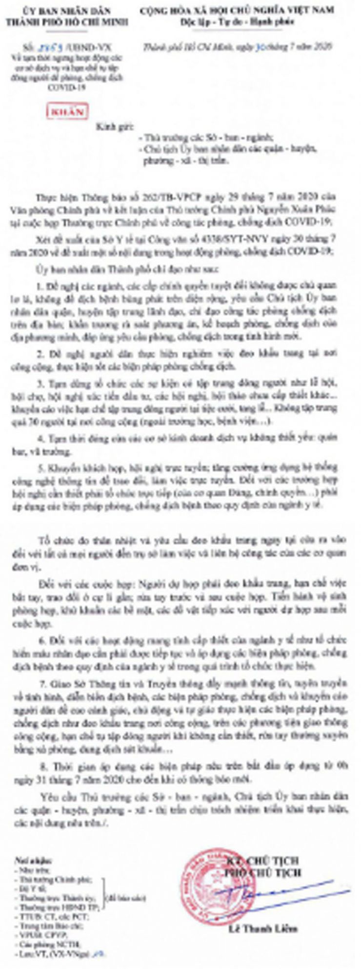 Thời gian áp dụng các biện pháp nêu trên bắt đầu áp dụng từ 0h ngày 31-7-2020 cho đến khi có thông báo mới.