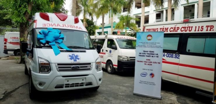 Chiều 21.7, Trung tâm cấp cứu 115 TP.HCM tiếp nhận một chiếc xe cấp cứu nhập khẩu, cùng trang thiết bị y tế trị giá 2,25 tỉ đồng do Công ty Intel Products Việt Nam phối hợp với Hiệp hội thương mại Mỹ tại Việt Nam (AmCham Việt Nam) trao tặng thông qua Ủy ban MTTQ Việt Nam TP.HCM và Sở Y tế TP.HCM.