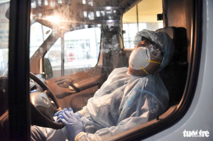 Tài xế Trần Tuấn Anh (29 tuổi) tức tốc khởi hành cùng đồng nghiệp đi đón người nghi nhiễm - Ảnh: DUYÊN PHAN