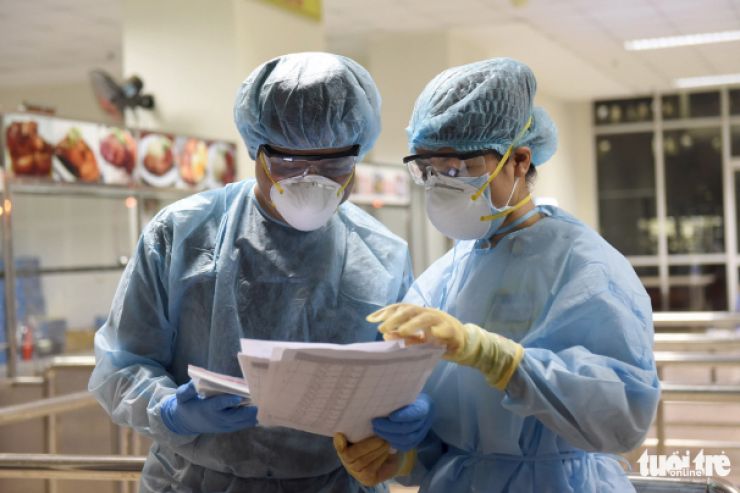 Nhân viên điều dưỡng làm hồ sơ bàn giao người nghi nhiễm cho Trung tâm cấp cứu 115 TP.HCM - Ảnh: DUYÊN PHAN