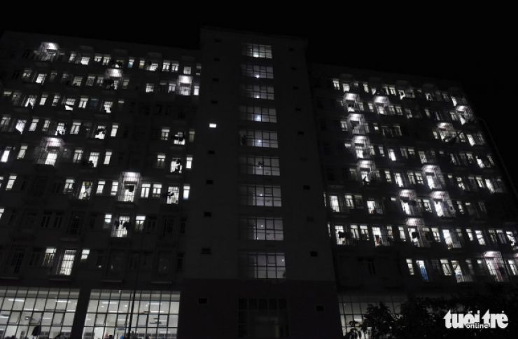 Khu cách ly KTX ĐHQG TP.HCM sáng đèn, ảnh chụp tối 22-3 - Ảnh: DUYÊN PHAN