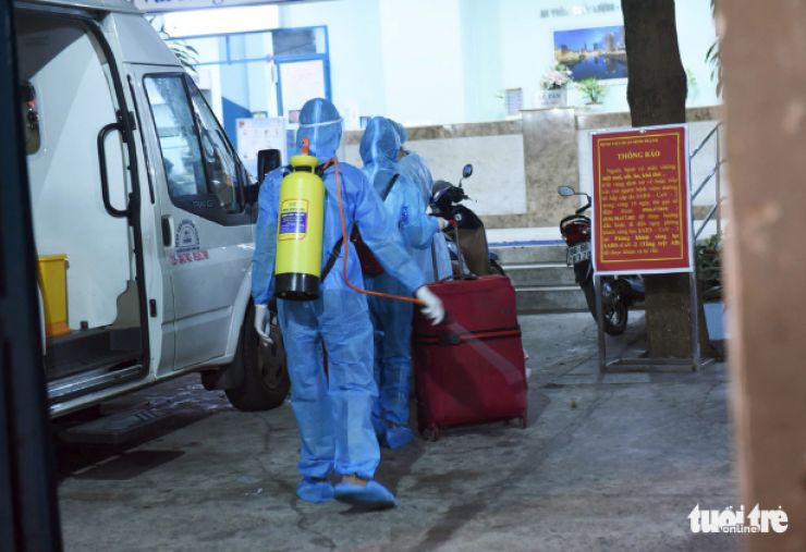 Sau khi được đưa từ khu cách KTX khu A ĐH Quốc gia TP.HCM về Bệnh viện quận Bình Thạnh đêm 22-3, người nghi nhiễm được khử khuẩn từ khi bước xuống xe - Ảnh: DUYÊN PHAN
