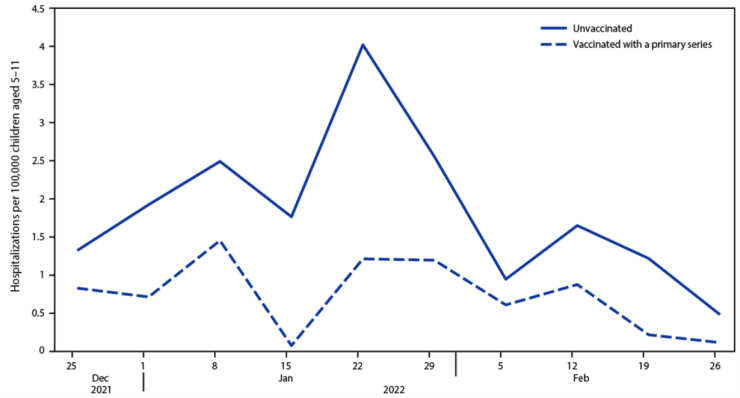 Điều đáng ghi nhận khác đó là từ sau ngày 2/11/2021, trẻ em từ 5-11 tuổi tại Mỹ bắt đầu được tiêm chủng vắc xin COVID-19 (nếu đủ điều kiện), kết quả khảo sát 397 trẻ em mắc COVID-19 nhập viện trong giai đoạn từ 19/12/2021 đến 28/2/2022 - là giai đoạn biến chủng Omicron chiếm ưu thế tại Mỹ - ghi nhận có đến 87% trẻ chưa được tiêm chủng, 30% không có bệnh lý nền và 19% phải điều trị tại Khoa Hồi sức tích cực (ICU). Ngoài ra, khảo sát cho thất tỷ lệ nhập viện ở trẻ em từ 5–11 tuổi trong nhóm chưa tiêm chủng vắc xin phòng COVID-19 cao gấp 2,1 lần so với nhóm trẻ đã tiêm chủng.