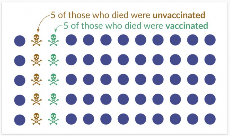 Các chuyên gia nhắc lại những nguyên tắc cơ bản cần phải tuân thủ khi phân tích tử vong liên quan đến tiêm vắc xin. Thật sai lầm khi đăng tiêu đề "Một nửa số người tử vong đã được tiêm vắc xin” khi chỉ nhìn vào và chỉ phân tích 10 trường hợp tử vong, trong đó có 5 chưa tiêm và 5 đã tiêm vắc xin. Điều quan trọng cần phải biết trước khi đăng tải đó là: trong số chưa tiêm vắc xin, thì có bao nhiêu người sống ngoài số người đã chết; và trong số đã tiêm vắc xin, có bao nhiêu người đang sống ngoài số người đã chết?