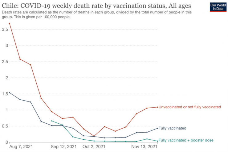 Tại Chile, tỷ lệ người dân tiêm đủ vắc xin phòng COVID-19 là 83%, chủ yếu là vắc xin Sinovac. Số liệu tử vong theo tình trạng tiêm chủng do Bộ Y tế công bố.