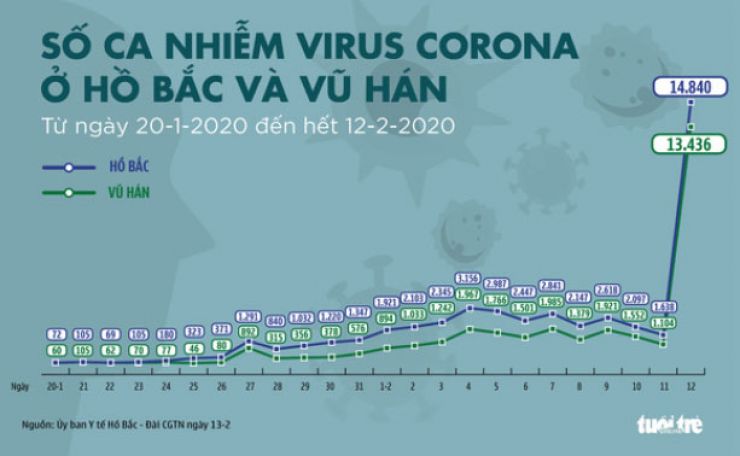 Số ca nhiễm mới tính đến cuối ngày 12-2 cũng tăng vọt lên con số 14.840 tại Hồ Bắc (tăng hơn 9 lần so với con số 1.638 ca nhiễm ngày 11-2), trong đó có tới 13.436 trường hợp chỉ tính riêng thành phố Vũ Hán, nâng tổng số ca nhiễm tại Hồ Bắc lên con số 48.206 trường hợp.