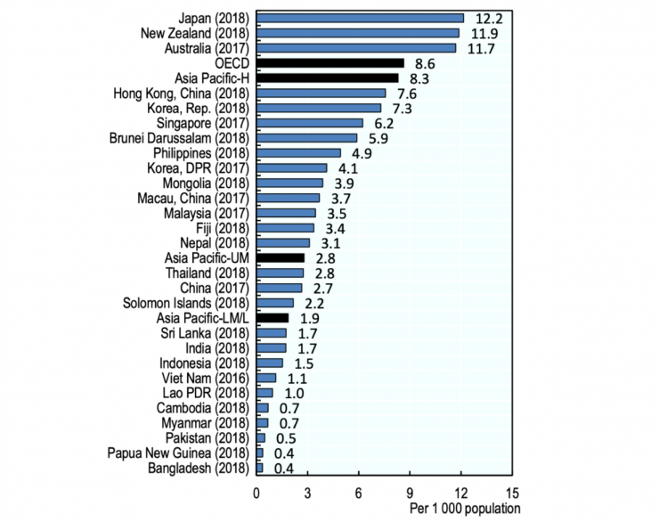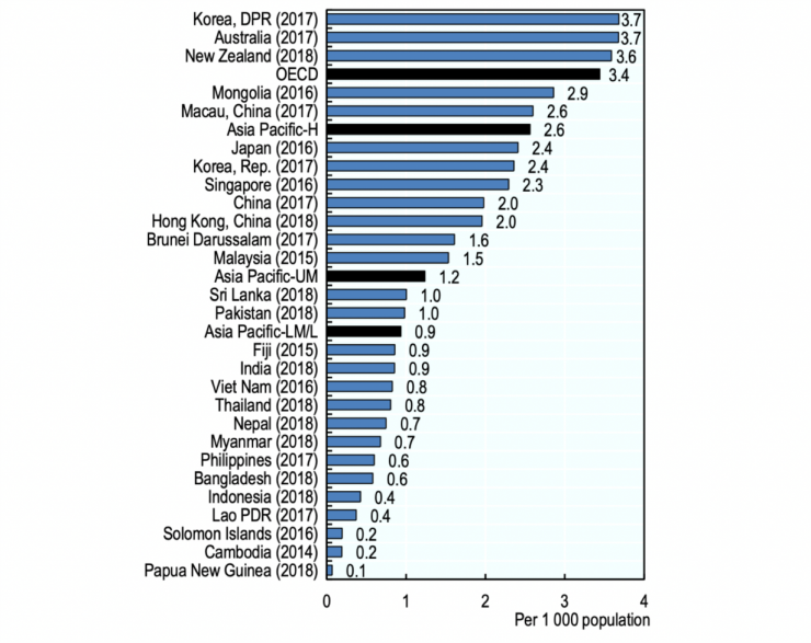 Số lượng bác sĩ trên 1.000 dân rất khác nhau giữa các quốc gia và vùng lãnh thổ thuộc khu vực Châu Á - Thái Bình Dương, nhìn chung thấp hơn mức trung bình của các nước thuộc Tổ chức Hợp tác và Phát triển Kinh tế - OECD. Chỉ số bác sĩ tại các quốc gia có thu nhập thấp và trung bình thấp là 1 bác sĩ trên 1.000 dân, trong khi ở các nước có thu nhập trên trung bình là 1,2 bác sĩ trên 1.000 dân. Đặc biệt, Úc và CHDCND Triều Tiên là 2 quốc gia có số lượng bác sĩ cao nhất với 3,7 bác sĩ trên 1.000 dân, cao hơn mức trung bình của các nước thuộc tổ chức OECD (3,4 bác sĩ trên 1.000 dân). Ngược lại, Papua New Guinea, Campuchia và Quần đảo Solomon có số lượng bác sĩ thấp nhất, bằng hoặc dưới 1 bác sĩ trên 5.000 dân.