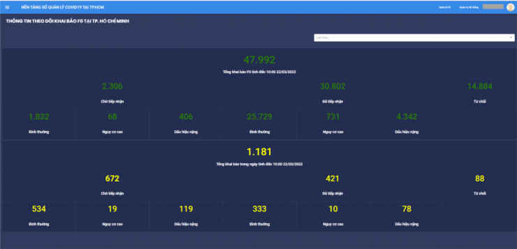 Tính đến 10 giờ 00 ngày 22/03/2022 đã có gần 48.000 lượt khai báo của người dân mắc COVID-19 được ghi nhận trên hệ thống, trong đó, các trạm y tế được hệ thống cảnh báo 731 trường hợp thuộc nhóm nguy cơ cao (trên 65 tuổi và có bệnh nền) cần được tư vấn và chăm sóc tại nhà, 4.342 trường hợp có dấu hiệu nặng (mệt/khó thở/đau tức ngực) được hệ thống cảnh báo đến các Trạm Y tế phường, xã để chủ động tư vấn và cung cấp thuốc điều trị kịp thời, cũng như hướng dẫn nhập viện ngay khi có chỉ định. Như vậy, công tác chuyển đổi số ngoài hiệu quả làm giảm phiền hà cho người dân mắc F0 còn có tính năng rất quan trọng là tăng cường phát hiện và bảo vệ người thuộc nhóm nguy cơ và người có dấu hiệu nặng, điều mà trước đây Ngành Y tế vẫn còn lo khi thực tế vẫn còn bỏ sót một số người thuộc nhóm nguy cơ và người có triệu chứng nặng.