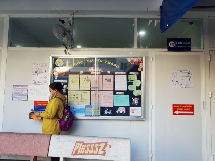 Người nhà bệnh nhân đang xem tờ rơi hướng dẫn phòng, chống dịch virus Corona mới (nCoV)