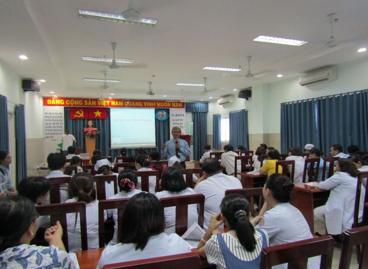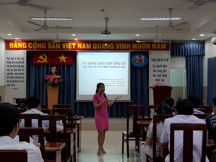 Thực hiện Kế hoạch số 1699/KH-BV ngày 27/05/2019 về việc tập huấn kỹ năng giao tiếp, ứng xử, nâng cao Y đức cho nhân viên Y tế Bệnh viện Quận 11 năm 2019, nhằm trang bị những kiến thức về văn hóa, kỹ năng và các quy ước mẫu về giao tiếp ứng xử cho cán bộ y tế trong đơn vị, góp phần hiệu quả “Đổi mới phong cách thái độ phục vụ của cán bộ y tế, hướng tới đáp ứng sự hài lòng của người bệnh”, học tập và làm theo tấm gương đạo đức Hồ Chí Minh, Bệnh viện Quận 11 tổ chức tập huấn giao tiếp nâng cao kỹ năng ứng xử cho nhân viên Y tế năm 2019 cho 100% cán bộ, viên chức, người lao động. Báo cáo viên là Ths. Lương Văn Minh - Phó Giám đốc Trung tâm Truyền thông - Giáo dục sức khỏe và Bs. Nguyễn Thu Quê Hương - Trung tâm Truyền thông - Giáo dục sức khỏe.