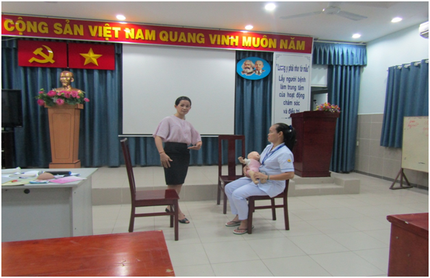 Buổi học thứ 2, Bs CK 1. Nguyễn Ngọc Thùy Dương, Trưởng khoa Sức khỏe trẻ em – PCSDD đã cung cấp các kiến thức nuôi con bằng sữa mẹ từ đó hướng dẫn các học viên thực hành bệnh viện về tư vấn và nuôi con bằng bằng sữa mẹ
