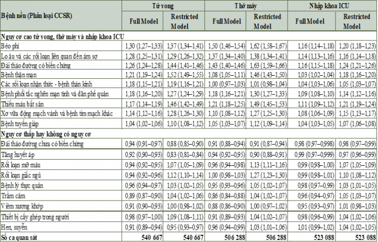 Bệnh nền là một thuật ngữ y tế để chỉ rủi ro (nguy cơ) về sức khỏe. Có 18 loại bệnh nền thường gặp trong nghiên cứu này nhưng chỉ có 09 bệnh trong số đó thực sự có liên quan có ý nghĩa đến người bệnh Covid-19 chuyển nặng phải nhập khoa ICU, thở máy và tử vong. Dưới đây là danh sách 09 bệnh nền đi kèm làm tăng nguy cơ nhập ICU, thở máy và tử vong cũng như 9 bệnh nền có nguy cơ thấp hay không có nguy cơ (bảng 1):