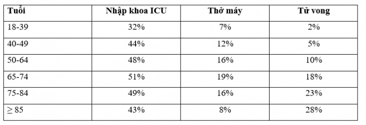 - Nhóm tuổi từ 18-35: có 32% được đưa vào khoa ICU, 7% cần thở máy và 2% tử vong.