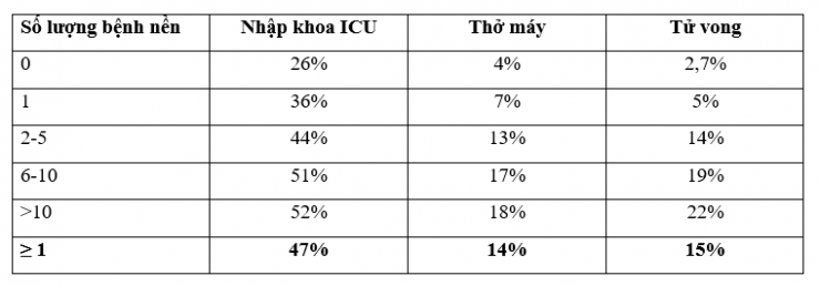 - Nhóm không có bệnh nền: Nhập khoa ICU 26%, thở máy 4%, tử vong 2,7%.