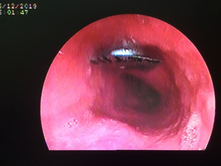 Chiều ngày hôm trước, bệnh nhân vào Khoa Cấp cứu trong tình trạng đau tức ngực sau xương ức do nuốt phải vỏ thuốc còn nguyên vỏ. Sau đó, bệnh nhân được chuyển vào phòng Nội soi để tiến hành nội soi, chẩn đoán cho thấy dị vật viên thuốc còn nguyên vỏ kích thước 9 x 9mm, hình vuông cạnh sắc bén như dao ở thực quản đoạn giữa, có nguy cơ gây thủng thực quản vào trung thất có thể dẫn đến tử vong.