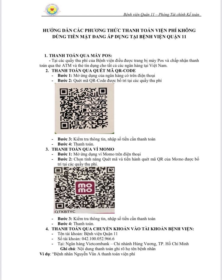 Hướng dẫn các phương thức thanh toán viện phí không dùng tiền mặt đang áp dụng tại Bệnh viện Quận 11