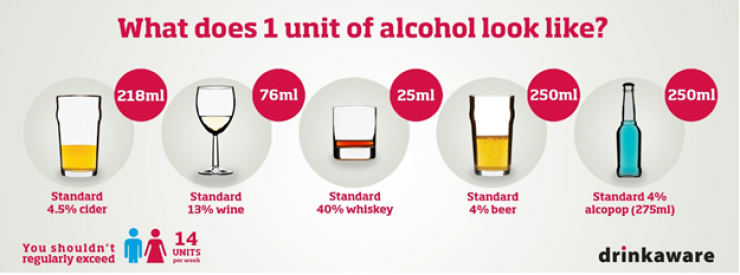- Uống rượu: Nam giới không uống hơn 10 đơn vị rượu trong 1 tuần, nữ giới không uống hơn 7 đơn vị rượu trong 1 tuần. 01 đơn vị rượu được định nghĩa là 01 lon bia 330 ml có nồng độ 5% hoặc 75 ml rượu vang 13% (hình bên dưới sẽ mô tả rõ một đơn vị rượu để các bạn có thể dễ hình dung). Các bạn cũng phải lưu ý rằng không phải một hay hai ngày cuối tuần chúng ta uống 10 đơn vị rượu mà là chia đều ra trong 7 ngày nhé!