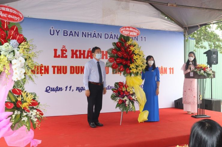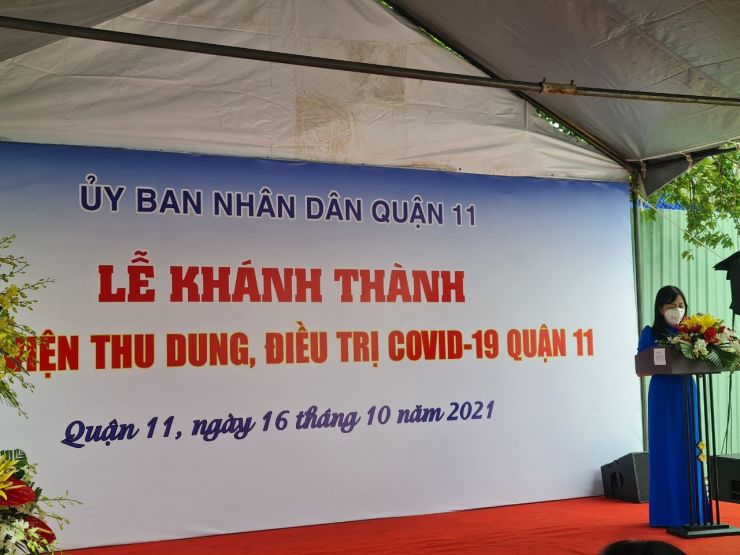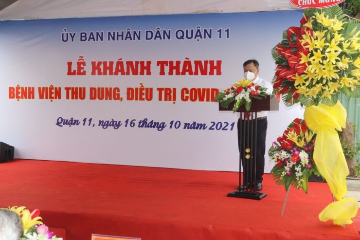 Phát biểu tại buổi lễ, đồng chí Trần Phi Long, Phó Bí thư Quận ủy, Chủ tịch UBND Quận 11 chia sẻ, “Bệnh viện thu dung, điều trị Covid-19 trực thuộc UBND Quận 11 được thành lập theo Quyết định 3287/QĐ-UBND ngày 10/9/2021 của UBND Thành phố. Trước tình hình dịch bệnh phức tạp trong những ngày qua, số ca nhiễm trong cộng đồng tăng liên tục tình trạng Bệnh viện Quận 11 hoạt động theo mô hình bệnh viện tách đôi luôn quá tải. Do đó, theo chỉ đạo của Thành phố, Quận đã chuyển công năng Khu cách ly tập trung Quận thành Khu cách ly tập trung người nhiễm Covid-19 để tiếp nhận, chăm sóc người nhiễm Covid-19 nhẹ, không kèm bệnh lý nền, xây dựng phương án mở rộng quy mô Khu cách ly để chăm sóc bệnh nhân Covid-19 theo phương châm “bốn tại chỗ” với mục tiêu hướng đến chuyển Bệnh viện Quận 11 thành Bệnh viện xanh, trở lại chức năng khám chữa bệnh ban đầu. Tính đến nay, Quận 11 đã đầu tư ước tính tổng kinh phí là 12 tỷ đồng để đưa vào hoạt động Bệnh viện thu dung, điều trị Covid-19 trên cơ sở chuyển đổi nguồn kinh phí của các hoạt động khác để tập trung cho công tác phòng chống dịch của địa phương. Dự kiến trong sáng thứ 2 đầu tuần, tất cả các bệnh nhân Covid-19 sẽ được chuyển sang điều trị tại nơi đây. Bên cạnh đó, lãnh đạo quận cũng đang chỉ đạo xây dựng tiếp tục khu vực ăn ở, sinh hoạt cho thân nhân người bệnh. Đây là một dấu mốc đáng ghi nhận của Quận 11 và mang ý nghĩa đặc biệt trong công tác khám chữa bệnh, chăm sóc sức khỏe cho người dân trên địa bàn”.