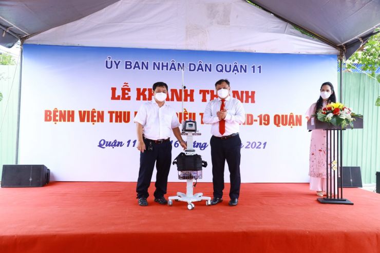 Lãnh đạo Sở Y tế, Quận ủy, Ủy ban nhân dân Quận 11 tặng hoa chúc mừng và trao tặng 05 máy trợ thở HFNC