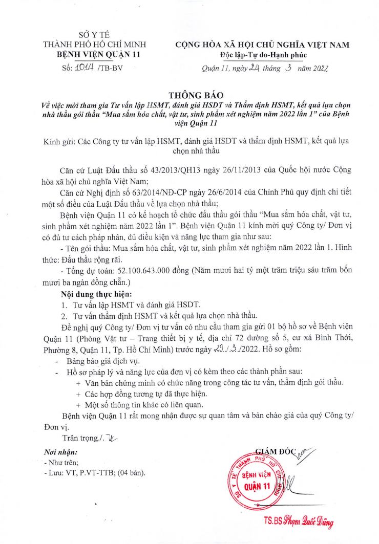 Thông báo mời tham gia Tư vấn, Thẩm định kết quả lựa chọn nhà thầu, gói thầu " Mua sắm hóa chất, vật tư, sinh phẩm xét nghiệm năm 2022 lần 1"của Bệnh viện Quận 11