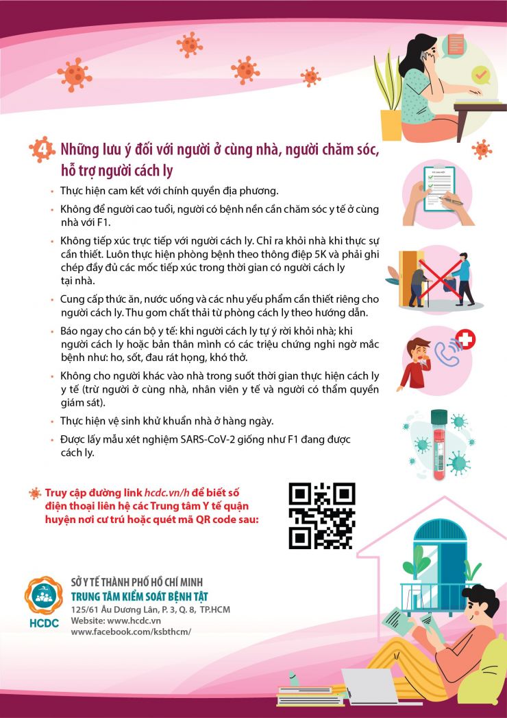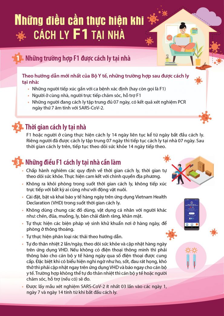 Theo đó, F1 hoặc người ở cùng thực hiện cách ly 14 ngày liên tục kể từ ngày bắt đầu cách ly. Riêng người đã được cách ly tập trung 7 ngày thì tiếp tục cách ly tại nhà 7 ngày. Sau thời gian cách ly trên, thực hiện theo dõi sức khỏe 14 ngày tiếp theo.