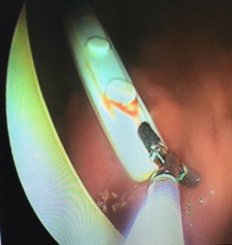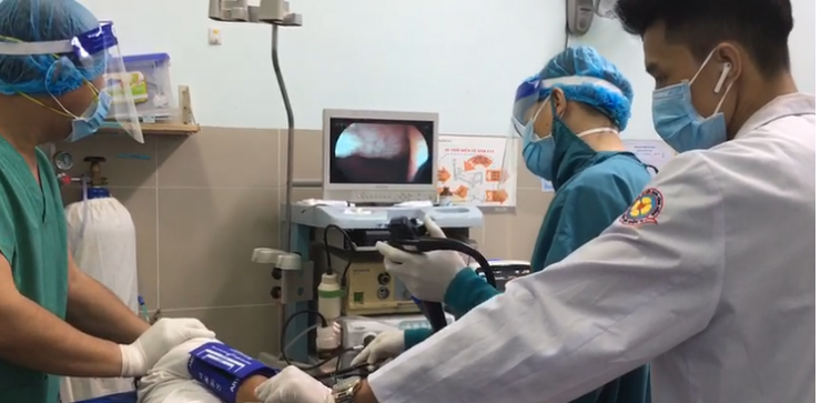 Khi có kết quả test nhanh Covid-19 âm tính với SARS-CoV-2, người bệnh được đưa vào phòng nội soi để gắp dị vật. Sau khi tiền mê, bác sĩ tiến hành nội soi dạ dày và phát hiện dị vật nằm ngang thành hang vị đâm vào thành trước sau tạo thành cây cầu. Các bác sĩ phải xử lý khẩn cấp để lấy dị vật ra nhằm tránh làm rách dạ dày thực quản.